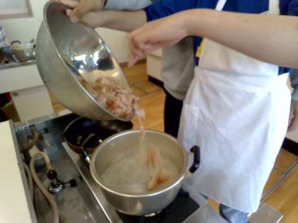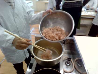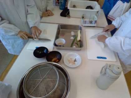 こんぶとかつおでだしをとり、(写真上・中)みそ汁を作りました。みそ汁の実はだいこん、うすあげ、ねぎ、わかめです。だいこんは、厚い、薄いのものもありましたが、みんなで、順番に気を付けて切っていました。(写真下)