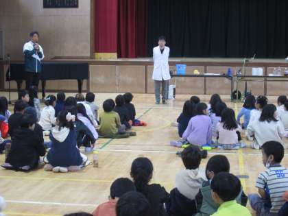 2時間目が終わって休み時間になると、全学年の児童がワクワクした表情で講堂に集まりました。今から始まるのは、十三小学校で初めての『サイエンス・ショー』です。