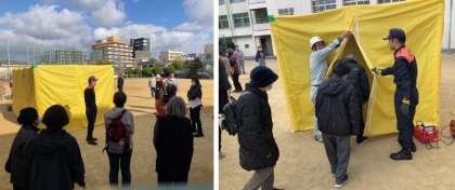「煙テント体験」では、実際に体験することで、火災などで煙が充満すると自分の伸ばした手の先すら見えないほど、視界が奪われることや、煙や高温の空気は高いところに行くので、避難するときは上に上がらず下のほうへ避難することがとても大切だということを学ぶことができました。