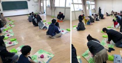 「救命処置体験」では、救命処置が必要な状況では、救急車やAEDの手配と併せて胸骨圧迫が非常に重要だということや、救急車が到着するまでの7分ほどの間、胸骨圧迫をし続けることの大変さも体験することができました。