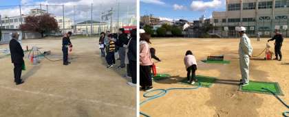 「消火訓練」では、消火器は炎の先ではなく火の元に向けて噴射すること、消えたと思っても使い切ることを学ぶことができ、実際の炎を水消火器で消火する体験もできました。
