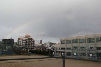 終業式の日、十三小の空に大きな虹がかかりました!よく見ると、講堂の校舎の上にまで途切れずに見えました。