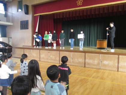 まず始めに、いろいろな図工展で入選した児童に、校長先生から賞状が手渡されました。トンボの絵や鉄道の絵など時間をかけて描いた作品が表彰されて、子ども達はとても嬉しそうでした。