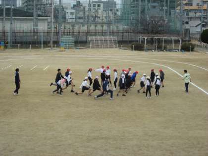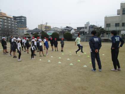 準備運動で体をほぐしてから、まずは足を大きく動かすトレーニングをしました。ふだんは走るなんて難しいことではないのに、「1歩の幅を大きく!」や「太ももを上に引き上げるように!」、「マーカーの間に2歩ずつ入れて!」など、コーチからいろいろな条件がつけられると考えて走るようになりました。