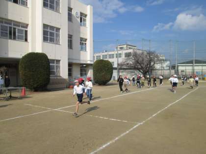 チャイムが鳴ると教室から子ども達が下りてきて、みんなで準備運動をして体をほぐすとスタートです。5分間のBGМが流れる間、自分のペースを守って走ります。かけ足が終わる頃には体もポカポカに温まって、子ども達の額にも汗が光っていました。