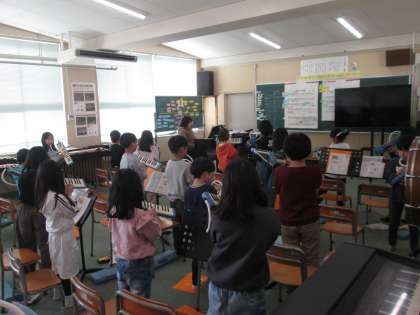 今日の音楽の授業は鍵盤ハーモニカの合奏からスタートです。子ども達の上達に合わせて曲のレベルが上がり、今では下のドから上のドまで音域が広がった曲を練習しています。