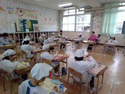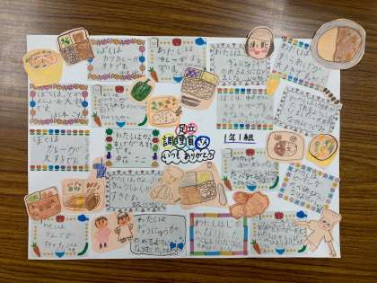 1月24日から30日までは、全国学校給食週間です。十三小学校では、1月27日から31日までを給食週間としています。今週は、給食調理員さんをクラスに招く「招待給食」をします。今日は、1年と2年に調理員さんを招いて、一緒に給食を食べ、みんなで作った感謝状を渡しました。