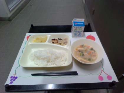 今日の献立は、おせち料理の一品「くりきんとん」塩こうじを使った「鶏肉の塩こうじ焼き」、酒かすを使った「かす汁」でした。(写真下)