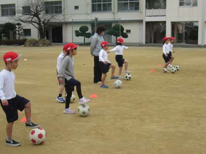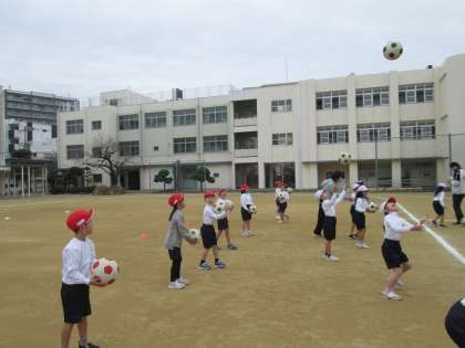 まずは、ボールを上に投げ上げて、落ちてきたところを両手でキャッチ。1年生の子ども達はボールをキャッチできたら、とっても嬉しそうな笑顔を見せていました。