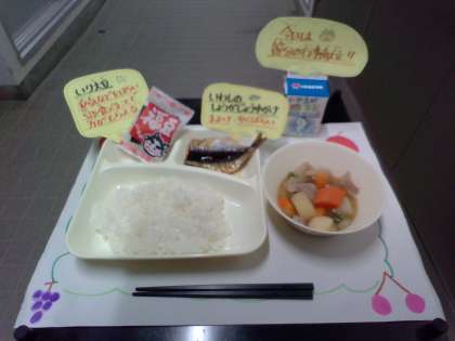 今日は、節分の行事献立で「いわしのしょうがじょうゆかけ、含め煮、いり大豆、ごはん、牛乳」でした。いわしは開きを一人一枚こんがり焼いてしょうがじょうゆのたれをかけました。含め煮は、じゃがいも、だいこん、にんじん、ごぼうなど具だくさんの煮ものでした。それと節分の福豆のいり大豆がつきました。暦では昨日が節分だったので、「昨日、豆食べたよ」という声をたくさん聞きました。
