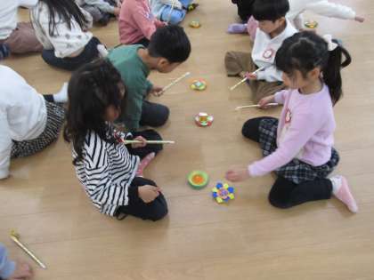 子ども達はさっそく、息をたくさん吸ってほっぺを膨らませて、吹きもどしを吹いてみました。「ヒュ−ッ」明るい笛の音が鳴って、ふくらんだ筒状の紙がスルスルと伸びていき、笛から口を離すと先の方からクルクルと紙を巻いて戻ってきます。その動きがおもしろくて、子ども達は夢中になって遊びました。