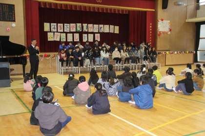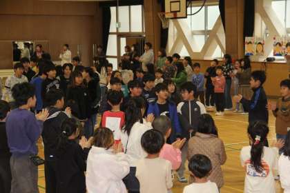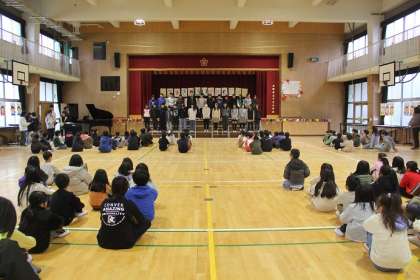 2時間目の始まりを告げるチャイムが鳴って、1年生から5年生の大きな拍手で、6年生のお兄さんとお姉さんを迎えました。今日の主役の6年生は、ひな壇に並ぶと少し照れくさそうな笑顔を浮かべています。
