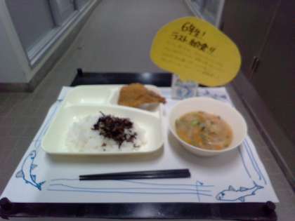 3月17日(月)は6年生最後の給食でした。「いわしフライ、みそ汁、牛ひじきそぼろ、ごはん、牛乳」でした。大阪市立の中学校へ進学する人は、小学校と同じ給食なので、また、楽しみにしててください。私立などへ進学する人は、給食やお弁当とあると思います。お昼ご飯は午後からの活力!どこへ行ってもしっかり食べて、元気に過ごしてください。健康が一番です!!!