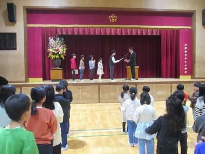修了式では学年の代表児童が舞台に上がり、校長先生から修了証を受け取ります。子ども達は一年の学習を修めた証明書を、自分も同じようにいただいた気持ちになって、みんなで大きな拍手をしました。