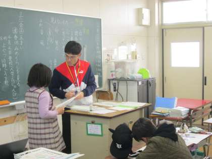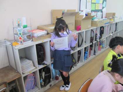 4年生の子ども達も、担任の先生から通知表『あゆみ』をもらっていました。前に出て担任の先生から通知表を受け取ると、自分の席や教室の端のほうに移動して、ゆっくりと表紙を開きます。