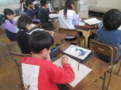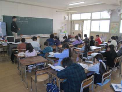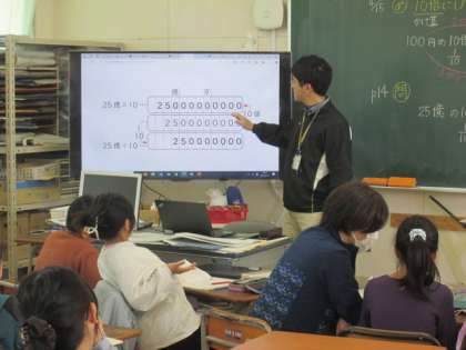 4年生の算数では、まず3年生で学習したことを振り返りました。先生が「100円を10倍すると? 100円を1/10倍すると?」と尋ねると、子ども達はすぐに「1000円」、「10円」と答えます。先生が重ねて「どうやって考えたの?」と尋ねると、「10倍のときは0が1つ増えて、1/10倍のときは0を1つ減らす。」とある児童が発表しました。