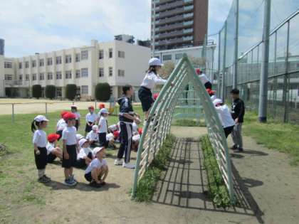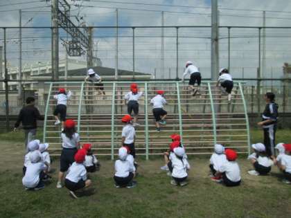 1年生は体育の学習で、「ゆうぐあそび」をしました。はしごがつながる雲梯にぶらさがってみたり、肋木を上って下りたり。