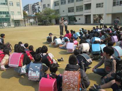 「集団下校では通学路の安全を確かめましょう。車とすれ違うときや横断歩道をわたるときは、6年生のみなさんが下級生のお手本になってください」。校長先生のお話を聞いて、さらに6年生の気持ちが引き締まります。