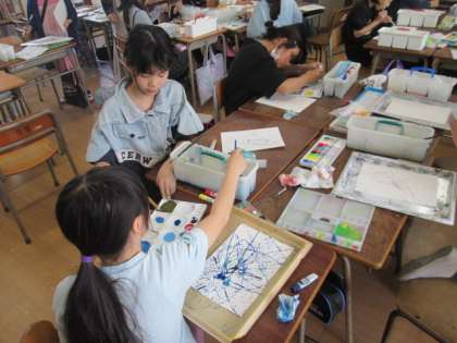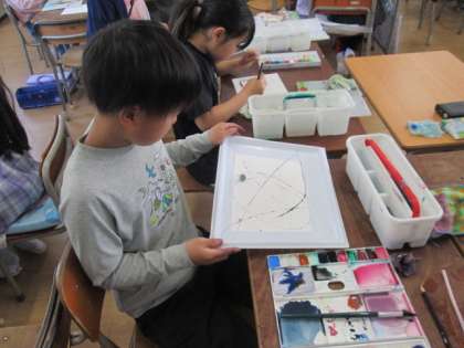 4年生の図工をのぞいてみると、何とも不思議な光景が。絵の具で絵を描いているはずなのに、子ども達は絵筆を持っていません。今回、絵を描くのに使う道具は、ビー玉とストローです。
