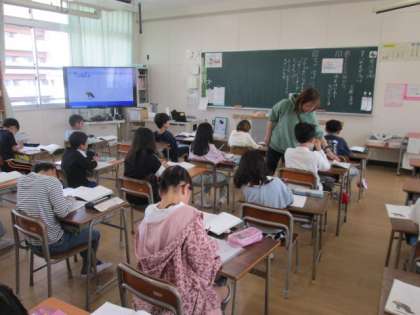 オノマトペが工夫された教材で、かえるの跳ね方も「どっすん・ぽこ。」や「ひらり・ぴょん。」など、とってもユニークです。かえるの様子や行動を想像して、子ども達は声に出して音読を楽しみました。