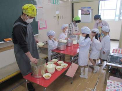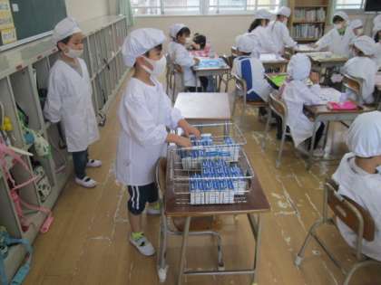 給食を教室まで運んだら、順番に配膳をしていきます。