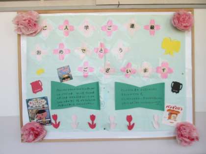 (上)図書室の前の掲示板には、司書の先生からのお知らせが掲示してありますが…。