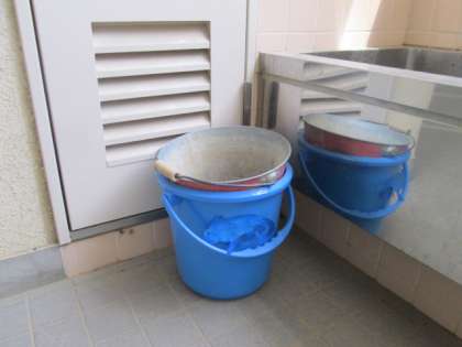 (下)手洗い場の前に置かれたバケツ。よく見てみると。