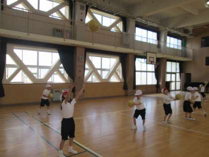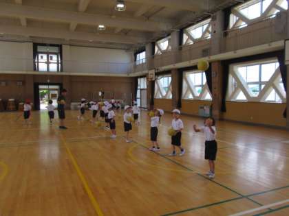 1年生は楽しい「ボールあそび」をしていました。まずは、一人ずつボールを両手で投げ上げて、落ちてきたところをキャッチします。