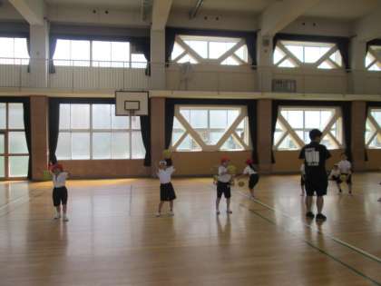 ボールが斜め上がるとキャッチするのが難しいので、まっすぐ上に投げるのが大事です。1年生の子ども達はボールを投げ上げて、キャッチするのを何度も繰り返して遊んでいました。