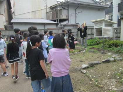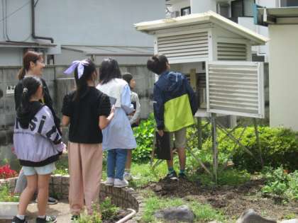 講堂の前に広がる花壇の東側の奥。小道を歩いていった先に、ひっそりと百葉箱が設置されています。4年生は理科で気温や天気について学習をしていて、教科書に出てきた百葉箱を実際に見に行きました。