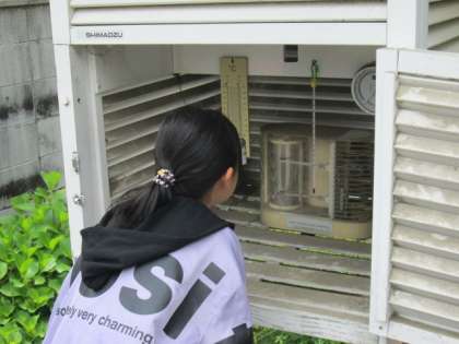 百葉箱の前の扉を開けてみると、温度計や湿度計がぶら下げられていて、記温の変化を自動で記録する機械も置かれていました。