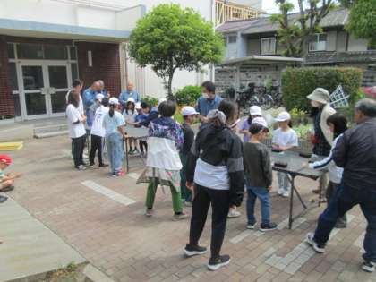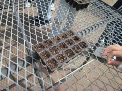 講堂の前に大きなテーブルを2つ並べて作業をしました。3年生の子ども達は2つのグループに分かれて、交代で育苗ポットの中にマリーゴールドの種を一つ一つ入れていきます。小さな種が風で飛んでいかないように気をつけながら、竹ひごの先を上手に使って丁寧に作業をしていました。