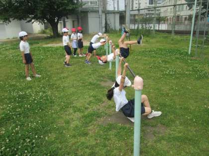 運動場の北側の芝生広場には子ども達が好きな遊具があります。3年生は体育の授業で、遊具を使っていろいろな動きを楽しんでいました。