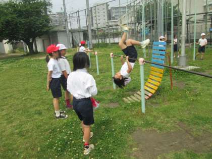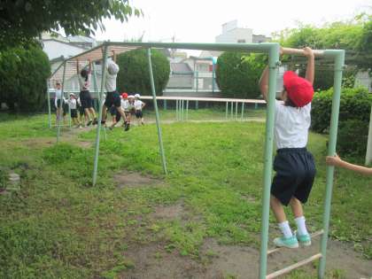 鉄棒で前回りや逆上がりをしたり、上り棒にしがみついて一番上まで上ったり、ジャングルジムや肋木に上がって移動したり、雲梯にぶら下がってジャンケンゲームをしたり。