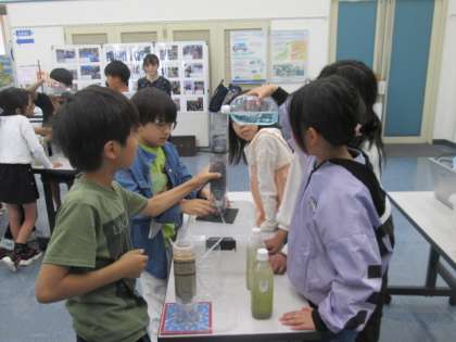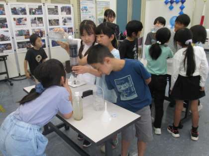 広大な浄水場の施設見学を終えて、水道記念館に戻りました。次はグループに分かれて、水をきれいにする実験をします。