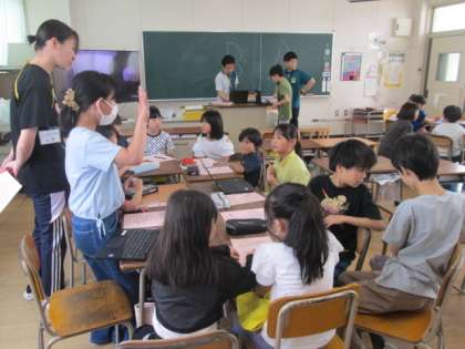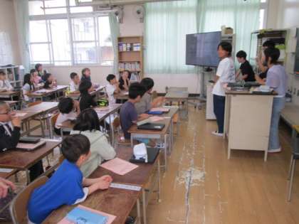 6月に開催される『十三わくわく商店街』に向けての準備が始まりました。たてわり班ごとにゲームのお店を開いて、お店番とお客さんのグループを交代して遊びます。