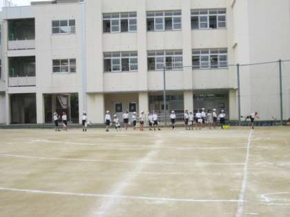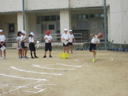 次は、5年生です。投げるボールの軌道が低くなりがちな児童には、先生が「もっと高い所を目印にして。」と、アドバイスを送っていました。