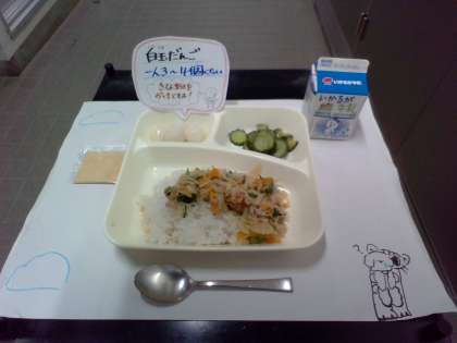 今日は「豚丼、きゅうりのかつお梅風味、白玉だんご(きな粉)、牛乳」でした。豚丼は豚肉、糸こんにゃく、たまねぎ、にんじん、青ネギを甘辛く味をつけ、ごはんの上にかけました。食べやすい味付けで、人気がありました。きゅうりのかつお梅風味はかつおと梅の味がきゅうりによくなじんでいました。そして、今日はデザートに白玉だんごがつきました。きな粉をかけていただきました。一人3〜4個でしたが、もっと食べたい!という声もたくさんありました。