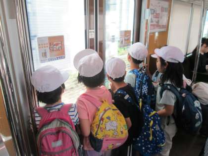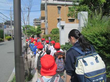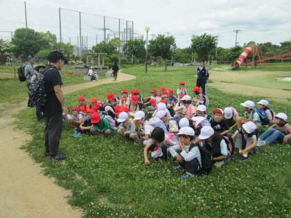 子ども達は学校を出発してからワクワクしどおしです。阪急電車に乗って、市街地の中を歩いて、目的地のふれあい緑地までたどりつきました。