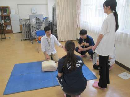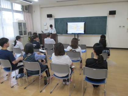 プールの授業が始まる時期に合わせて、教職員で救急救命講習の研修を行いました。まず始めに救命処置の大切さや、最近の対応の仕方について映像で学習をしました。