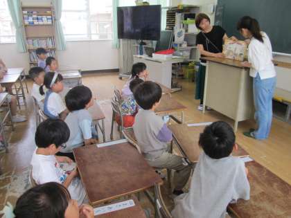 防災学習の後半は、絵本の読み聞かせです。主人公の男の子が家でお留守番をしているときに、大きな地震が起こってしまいます。大きな揺れ、大きな音、倒れる家具や割れるガラス。1年生の子ども達も息をのんで、お話を聞いていました。
