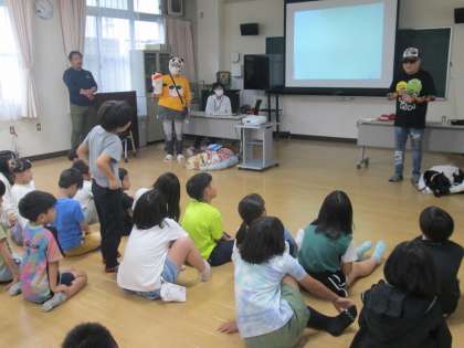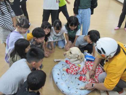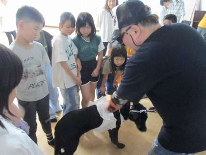 犬の種類や食事のことなど、いろいろと教えていただいてので、たくさん学習することができました。授業が終わってから子ども達は前に寄って、近くで2匹の盲導犬を見せてもらいました。子ども達は可愛いワンちゃんと近くでふれあえて、とっても嬉しそうでした。