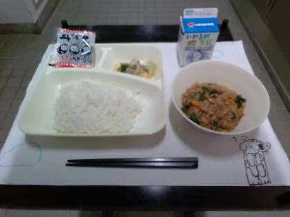 今日は「マーボーはるさめ、チンゲンサイともやしの甘酢あえ、いり黒豆、ごはん、牛乳」でした。マーボー春雨は、赤みそ、トウバンジャンなどを使用し、少しピリ辛でごはんによく合いました。それとさっぱりとした甘酢あえといり黒豆の組み合わせでした。