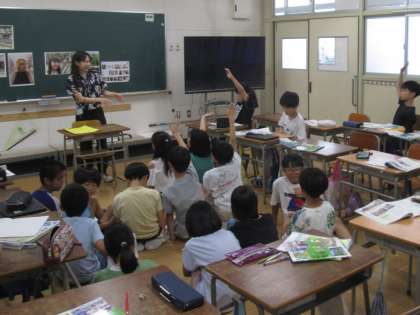 最後は、沖縄についての質問タイムです。子ども達からひっきりなしに質問の手が上がり、授業の終わりのチャイムが鳴るまで、たくさんの質問に答えてくださいました。