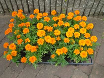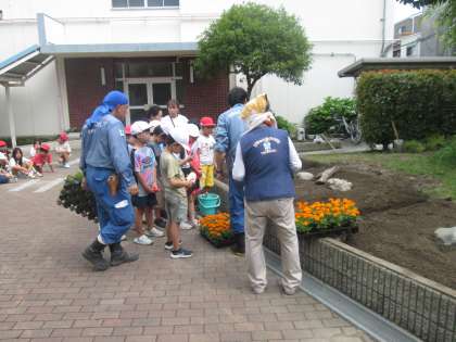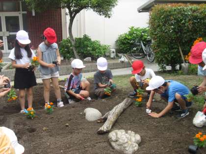 淀川区の「夢ちゃん花づくり隊」のみなさんにご協力いただき、3年生が春に種まきをして育ててきたマリーゴールドが小さな苗に育ちました。今日はオレンジと黄色の苗を、講堂の前の花壇に植え替えます。