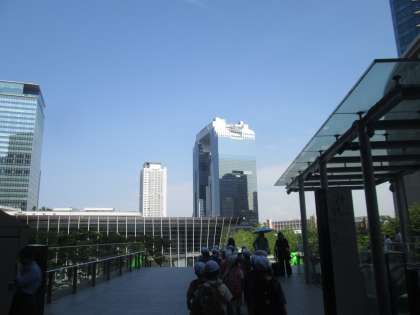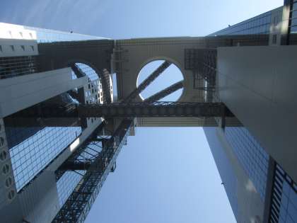 阪急梅田駅で電車を降りてJR大阪駅の方に歩いていくと、2つのビルが上の方でつながる梅田スカイビルの特徴的な建物が見えてきました。