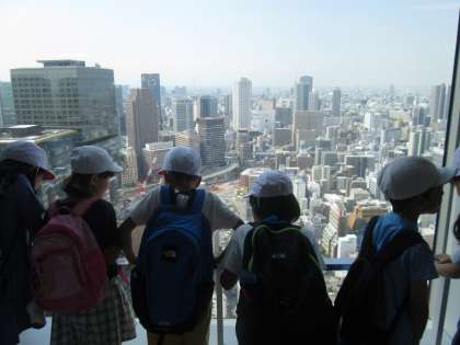 大きな窓に近づいて周りの景色を見ると、大きな淀川やそれを渡る阪急電車、ビルの向こうにはドーム球場などが見えました。見下ろすと、豆粒のように小さい自動車が、たくさん並んでゆっくりゆっくりと走っています。