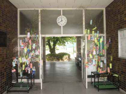 小学校の玄関の軒端には、先週末から大きな竹の木が置かれ、笹の葉がさらさらと風に吹かれています。子ども達が願い事を書いた短冊と、はぐくみの図書室開放で作られた飾りが竹の枝に吊るされて、七夕の日にきれいな笹飾りができました。