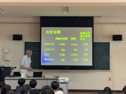 いろいろな疑問をもとに、動物たちの生活や体の特徴、命の不思議について、実際のエピソードや標本(ダチョウの卵)を交えながら、子どもたちに解説してくださいました。