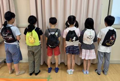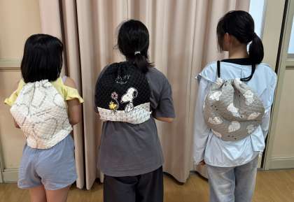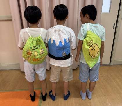 中には何もはいっていないけど、できあがったのが嬉しくてさっそく背負ってみました。林間学習へのワクワクがますます大きくなりました。